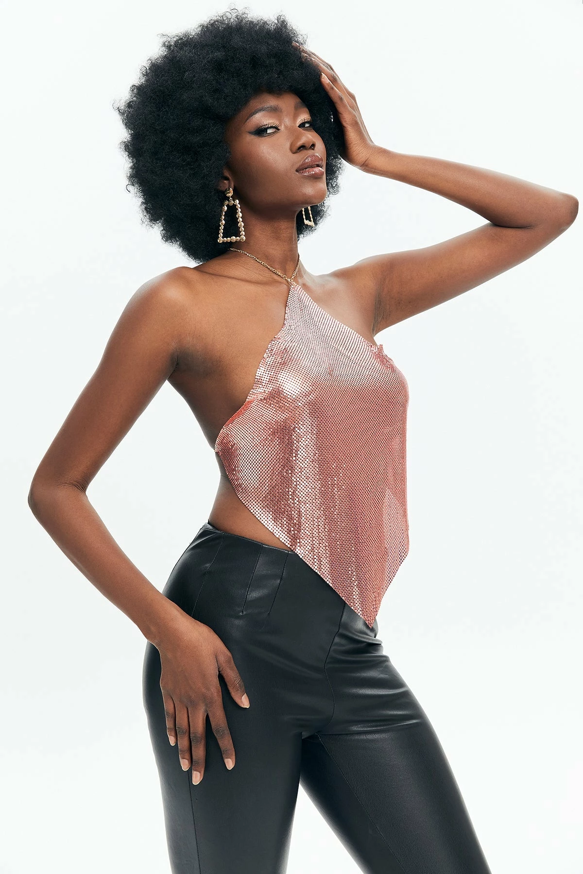 Style:SexyColor:Pink/GoldSeason:Spring/Summer/AutumnNeckline:Halter NeckSleeve Length:SleevelessHem Shaped:LooseComposition:100% Metal