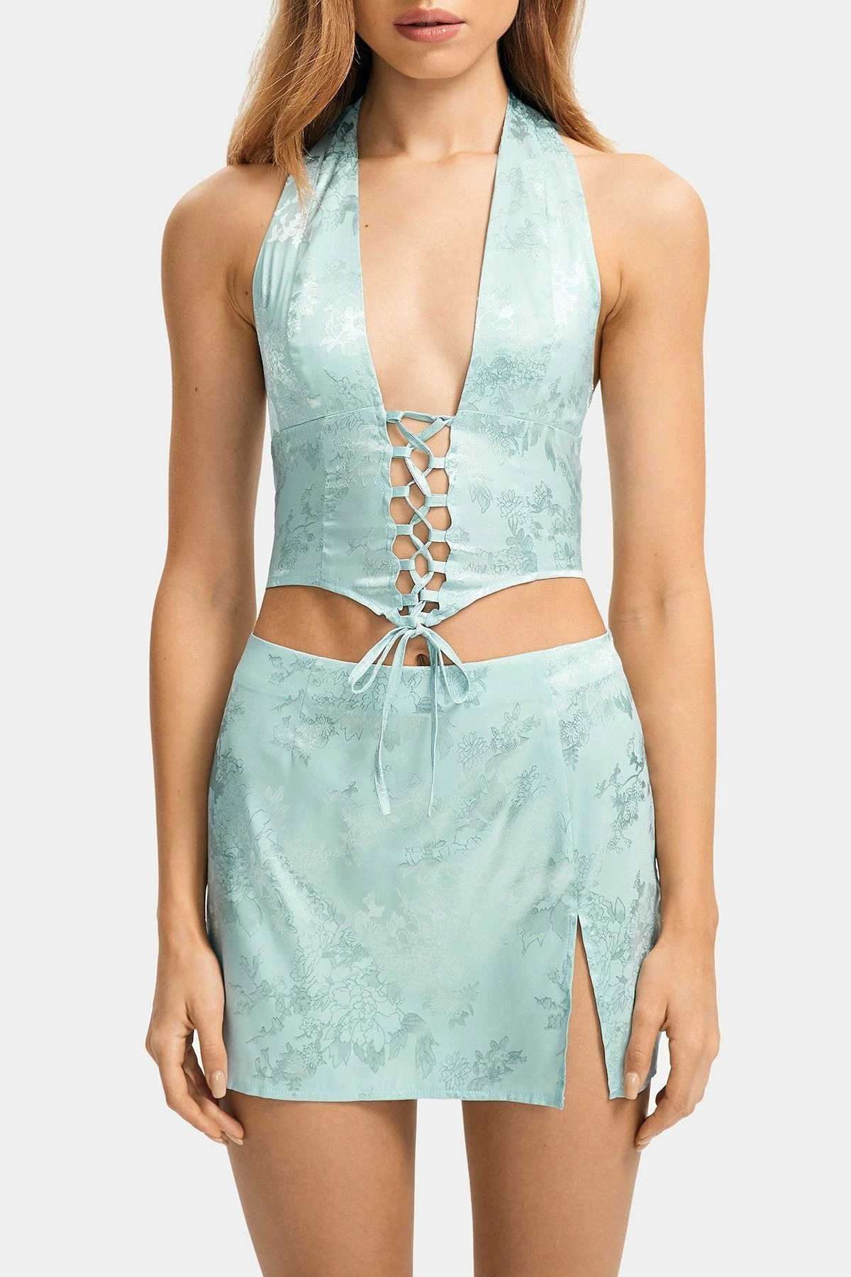 Be the first to review “SOLADO Halter Neck Floral Jacquard Lace Up Crop Top” Cancel reply
