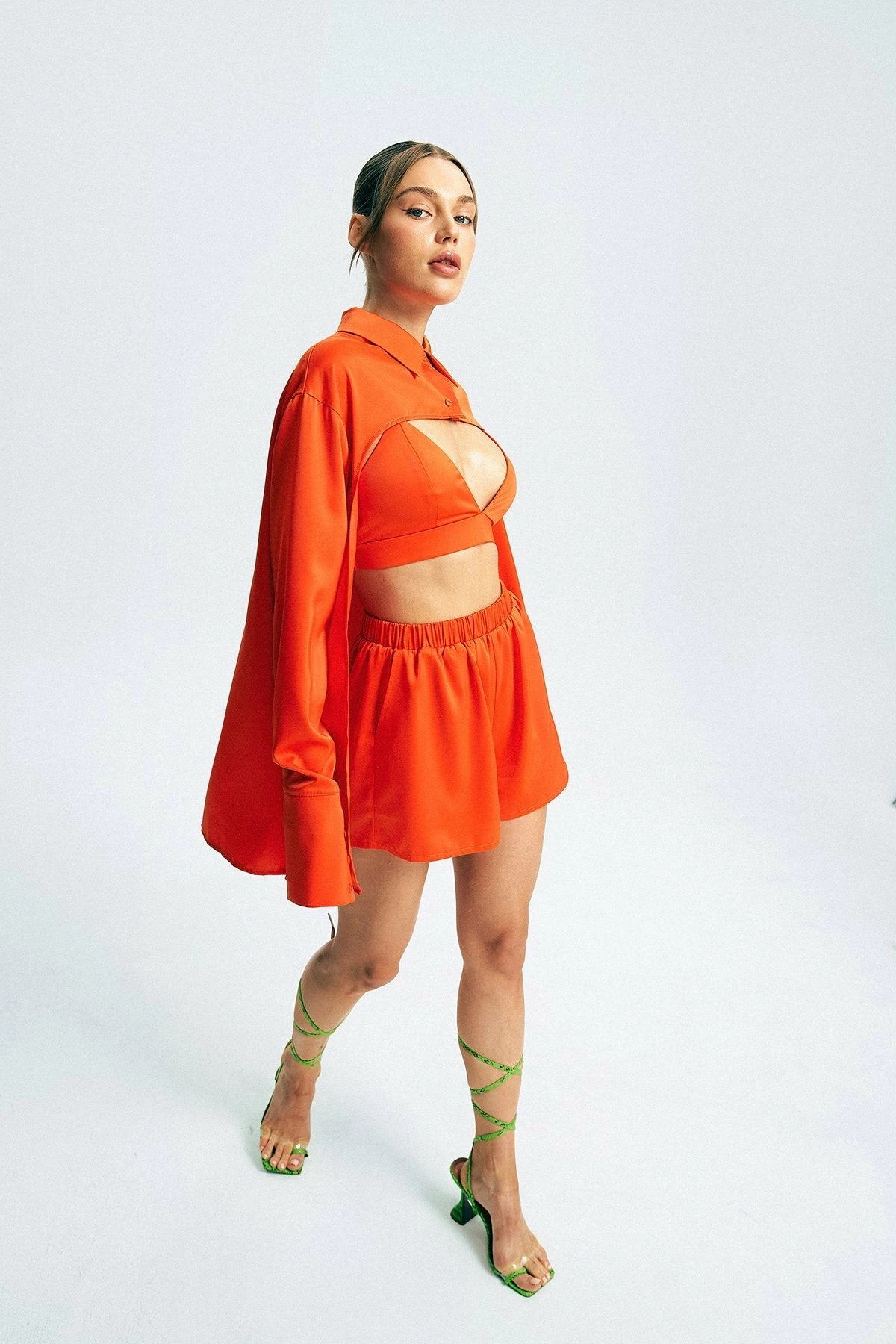 Style:SexyColor:OrangeSeason:SummerNeckline:Lapel NeckSleeve Length:Long SleeveHem Shaped:SlimComposition:90% Polyester, 10% Spandex
