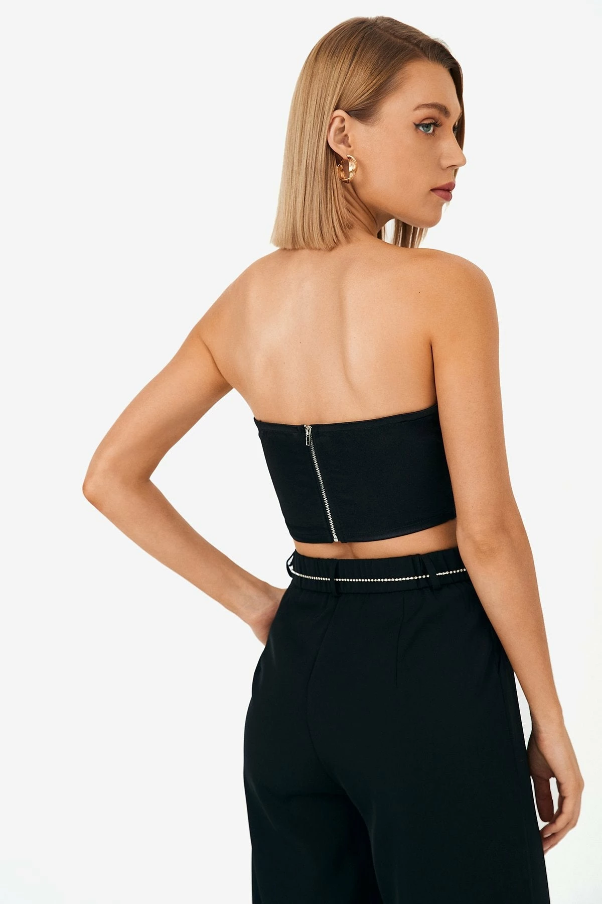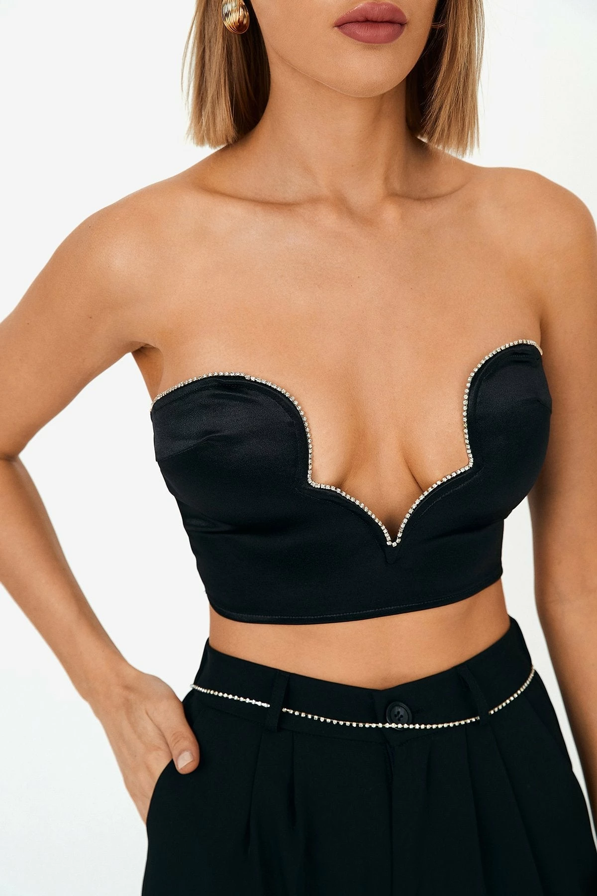 Be the first to review “SOLADO Plunging Neck Rhinestone Trim Zip Back Tube Crop Top” Cancel reply